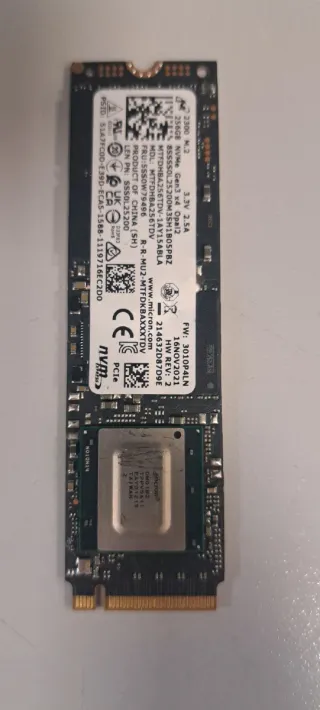 Unidad de estado sólido M.2 de 256GB 236 gb después de formateo Horas de uso en el reverso - Interfaz NVMe Gen3 x4. - Modelo 2300. - Fabricado por Micron.