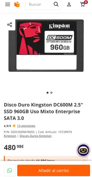 Disco duro SSD Kingston DC600M de 960GB. - Capacidad: 960GB - Interfaz: SATA 3.0 - Formato: 2.5 - Uso: Mixto Enterprise
