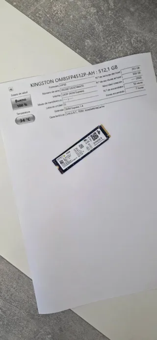 Vendo disco duro sólido SSD NVMe M.2 de la marca Kingston, modelo OM8SFP4512P-AH. Capacidad: 512 GB. ⚠️ ESTADO: Prácticamente a estrenar. - Solo tiene 7 horas de uso (verificado con CrystalDiskInfo). 🚀 Rendimiento: - Interfaz: PCIe Gen4 x4 (Muy rápido). - Formato: M.2 2280 (Compatible con la mayoría de portátiles modernos y torres). - Salud del disco: 100%. - Ideal para ampliar la memoria de tu portátil o PC y ganar velocidad de carga. 📍 Entrega en mano en Gijón. 📦 Envío rápido y protegido por Wallapop si lo prefieres.