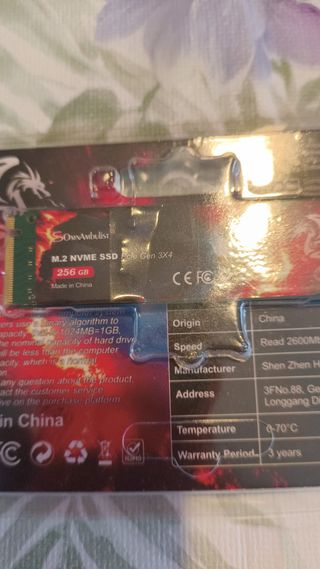 SSD M.2 NVMe de 256 GB con interfaz PCIe Gen 3x4. - Capacidad: 256 GB - Interfaz: M.2 NVMe PCIe Gen 3x4 - Velocidad de lectura: 2600 MB/s - Fabricante: Shen Zhen H - Periodo de garantía: 3 años - Temperatura de operación: 0-70°C