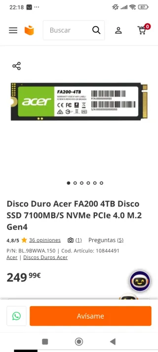 Disco duro SSD Acer FA200 de 4TB con tecnología NVMe PCIe 4.0. - Capacidad: 4TB - Interfaz: NVMe PCIe 4.0 M.2 - Velocidad de lectura: 7100 MB/s - Modelo: FA200 - La pareja son 400 euros - Uno 250 euros