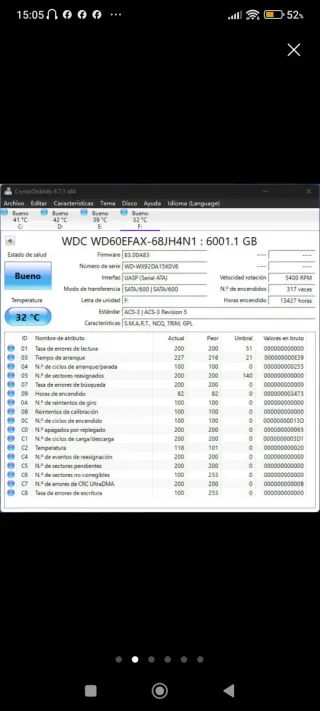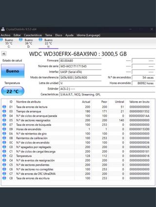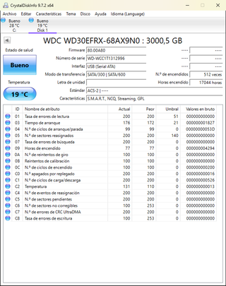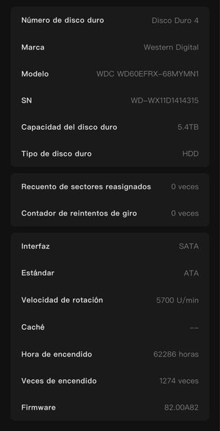 Disco duro WD Red de 6TB para NAS. Horas y estado del disco en la segunda fotografia. - Modelo: WD60EFRX - Capacidad: 6.0TB - Caché: 64MB - Interfaz: SATA - Tecnología: NASware 3.0 - Fabricado en Tailandia