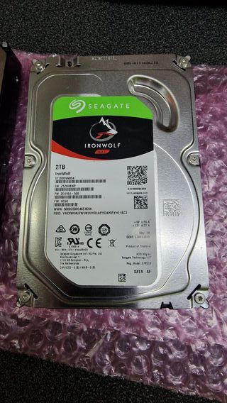 Disco duro Seagate IronWolf de 2TB, diseñado para NAS. - Capacidad: 2TB - Modelo: ST2000VW004 - Serie: 2529HBNP - PN: 264164-500 - Firmware: 8050 - WWN: 50000500C46EACSA - PSID: YNXWBALRWUKUUYRLAPYD42CRYHF1803 - Voltaje: +5V 0.55 A, +12V 0.37 A - Sitio: TK - DOM: 2706C2010 - Fabricado en Tailandia