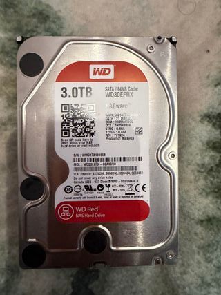 Disco duro WD Red de 3TB, diseñado para NAS. - Capacidad: 3TB - Caché: 64MB - Modelo: WD30EFRX - Voltaje: 5VDC 0.60A / 12VDC 0.45A - Fabricado en Malasia NO SE ENVIA. Entrega solo en mano en Bizkaia
