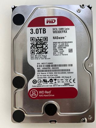 Disco duro WD Red de 3TB, diseñado para NAS (Network Attached Storage). - Capacidad: 3TB - Caché: 64MB - Modelo: WD30EFRX - Interfaz: SATA - Voltaje: 5VDC 0.60A / 12VDC 0.45A - Fabricado en Malasia NO SE ENVIA. Entrega solo en mano en Bizkaia
