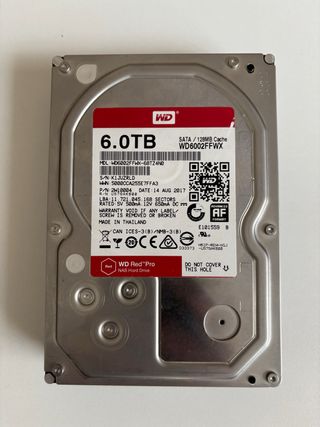 Disco duro WD Red Pro de 6TB, diseñado para NAS. Con poco uso en Nas para copias de seguridad y plex. - Capacidad: 6TB - Caché: 128MB - Interfaz: SATA - Modelo: WD6002FFWX ✅ En perfectas condiciones y funcionando sin problemas. Entrega en mano en Madrid centro o envio