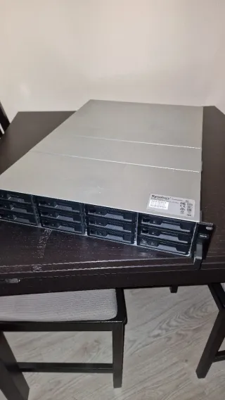 Unidad NAS Synology RS2418+ en formato rack. - Diseño metálico plateado. - Frontal con bahías para 12 discos duros. - Perfecto estado