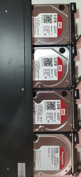 Se venden cuatro discos duros WD Red de 4TB cada uno, ideales para sistemas NAS. - Capacidad: 4TB por disco. - Modelo: WD40EFRX. - Tecnología: NASware 3.0.