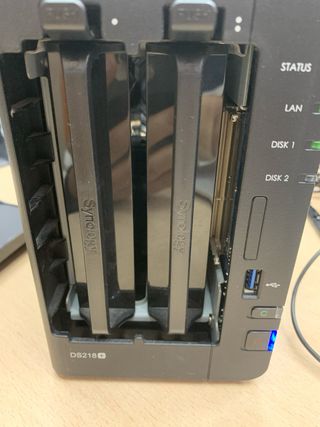 Dispositivo NAS Synology DS218+ con dos bahías para discos duros. Perfecto estado. Sin discos - Diseño compacto y elegante. - Indicadores LED de estado. - Puerto USB frontal para acceso rápido.