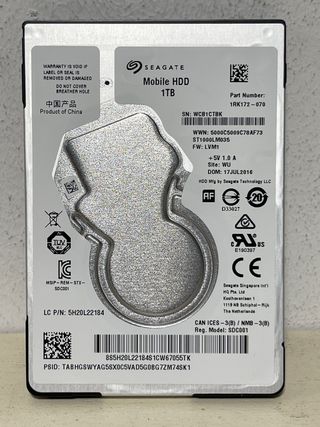 Disco duro interno de 2.5 pulgadas con capacidad de 1TB. Sí, es caro, pero mira los días de uso. - Modelo: ST1000LM024 - Interfaz: SATA - Grosor: 9mm - Voltaje: +5V 0.85A - Fabricado en China