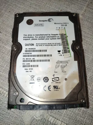 Disco duro interno Seagate Momentus 5400.4 de 250 GB. - Modelo: ST9250827AS - PN: 90G134-285 - Firmware: 3.AAA - Fecha de fabricación: 09183 - Sitio de fabricación: WU