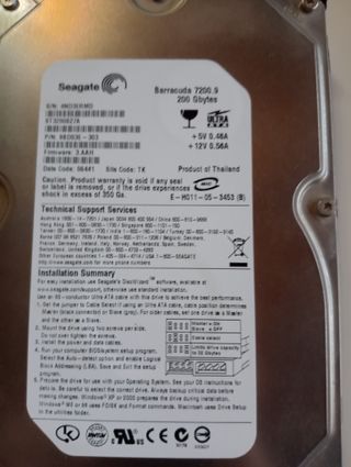 Disco duro interno Seagate Barracuda 7200.9 de 200 GB. - Modelo: ST3200827A - Capacidad: 200 Gbytes - Interfaz: Ultra ATA - Producto de Tailandia