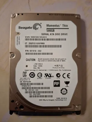 Disco duro interno de 2.5 pulgadas con 500GB de capacidad. - Modelo: Momentus Thin - Interfaz: Serial ATA (SATA) - Número de parte (P/N): 691918-002 - Número de serie (SN): W3P432XF - Firmware (FW): 1002YAM1 - Fabricado por Seagate Technology LLC - Fecha de fabricación: 03/2014