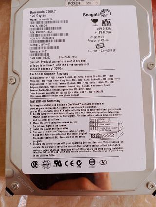 Disco duro interno Seagate Barracuda 7200.7 de 120 GB. - Modelo: ST3120022A - Interfaz: IDE (Ultra ATA) - Capacidad: 120 Gbytes - Firmware: 8.01 Se hacen envíos por wallapop