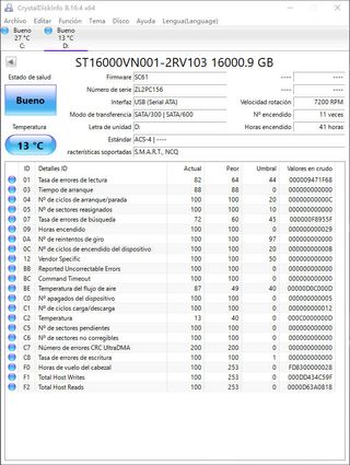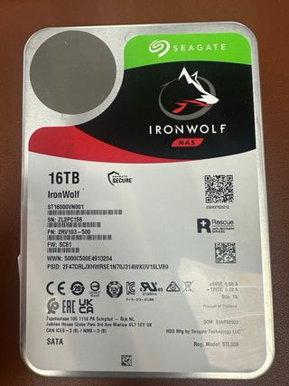 Disco duro interno de 16TB de capacidad. Modelo ST16000VN001-2RV103. - Interfaz: USB (Serial ATA) - Velocidad de rotación: 7200 RPM - Horas encendido: 41 horas - Firmware: SC61