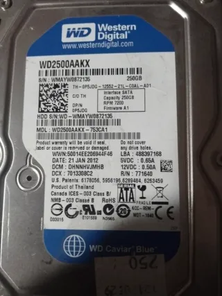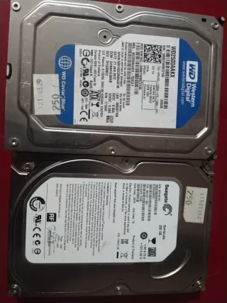 Se venden dos discos duros, uno de Western Digital y otro de Seagate, ambos con capacidad de 250GB. - Disco duro Western Digital Caviar Blue, modelo WD2500AAKX. - Disco duro Seagate Barracuda, modelo ST2500M000. - Ambos discos son de 3.5 pulgadas y SATA.
