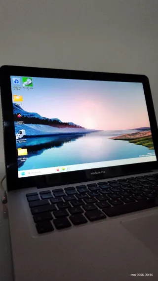 Portátil MacBook Pro en color plata. Ideal para tareas diarias y profesionales. - Disco duro Kingston SSD 128GB. - Memoria RAM ELPIDA 4GB DDR3. - Procesador INTEL. WINDOWS 11 INSTALADO Fácil de actualizar hasta 16 GB ddr3 , cambio batería, segundo disco duro. Etc.. Único en todos los MacBook fabricados vienen los componentes soldados. Está en muy buen estado, se regala bolsa transporte a estrenar, ratón Windows, tarjeta sonido externa USB.