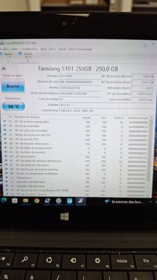Vendo disco SSD Fanxiang S101 de 250GB en formato 2.5" SATA. Ideal para acelerar un ordenador lento o como almacenamiento externo. Estado de salud: "Bueno" en CrystalDiskInfo. Uso real: Solo 3,610 horas de encendido. Especificaciones: Interfaz SATA III 6Gb/s. Fiabilidad: Cero errores de sectores reasignados o fallos de programa. Precio cerrado. Entrega en mano o envío rápido por Wallapop.