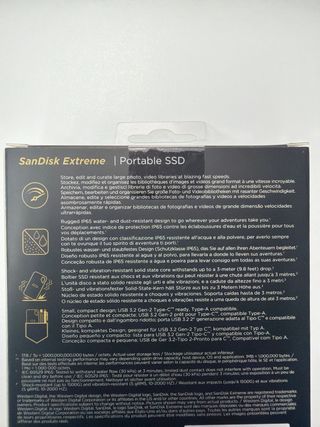 Producto precintado, sin estrenar. Unidad de estado sólido portátil SanDisk Extreme de 4 TB. Diseñada para un almacenamiento de alta velocidad. - Capacidad de 4 TB. - Velocidades de lectura de hasta 1050 MB/s. - Velocidades de escritura de hasta 1000 MB/s. - Resistente al agua. Preferible trato en mano. Mirar precio de este disco en web como amazon, 460€.
