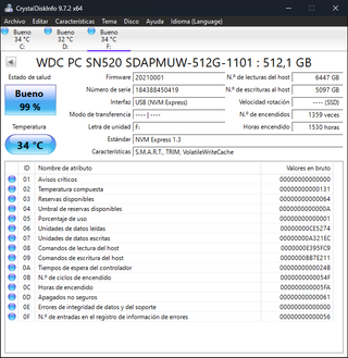 Disco de estado sólido Intel SSDPEKNW512GZL de 512,1 GB. - Capacidad: 512,1 GB - Interfaz: USB (NVM Express) - Firmware: C01C - Número de serie: PHKA21310K1U512A - Horas encendido: 316 horas - N.º de encendidos: 544 veces