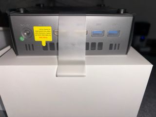 Mini PC compacto y elegante con múltiples puertos para una conectividad versátil. - Puerto de alimentación. - Puerto de audio R. - Dos puertos USB. - Puerto USB-C.