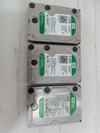 Lote de tres discos duros WD Green de 2TB cada uno. Ideales para almacenamiento. - Capacidad: 2TB por disco. - Modelo: WD20EZRX y WD20EARS. - Interfaz: SATA. - Caché: 64MB.