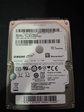 Disco duro interno Samsung de 750GB. - Modelo: ST750LM022 - Part Number: HN-M750MBB/AS1 - Capacidad: 750.0 GB - Voltaje: DC+5V 0.85A Funciona perfectamente