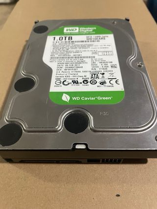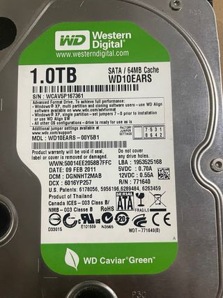 Disco duro interno de 1TB de capacidad, modelo WD Caviar Green. - Capacidad: 1.0TB - Interfaz: SATA - Caché: 64MB - Modelo: WD10EARS - Fecha de fabricación: 09 FEB 2011 - Está formateado bajo nivel, y testeado, 100% clusters correctos
