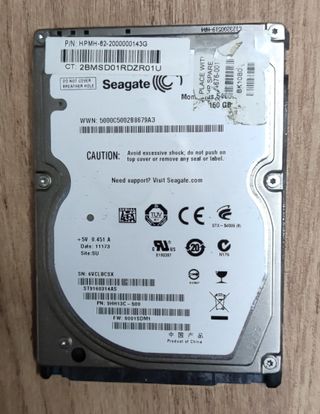 Disco duro interno Seagate de 160 GB. Comprobado con éxito. - Modelo: ST9160314AS - Interfaz: SATA 3 Gbit/s - Formato: 2.5 pulgadas - Capacidad: 160 GB - Velocidad: 5400 rpm - Firmware: 0001SDM1 - Fabricado en China.