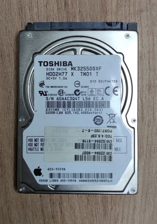 Disco duro interno Toshiba de 320GB. Comprobado con éxito. - Modelo: MK3255GSXF - Interfaz: SATA 3 Gbit/s - Formato: 2.5 pulgadas - Capacidad: 320GB - Velocidad: 5400 rpm