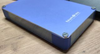 Disco duro externo de la marca Iomega. Su diseño es plateado y compacto. - Carcasa metálica. - Indicador LED.
