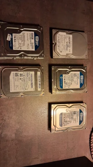 Lote de cinco discos duros de 1TB cada uno. Incluye unidades de las marcas Hitachi y Western Digital. - Capacidad: 1TB por unidad. - Marcas incluidas: Hitachi y Western Digital. - Ideales para almacenamiento adicional.