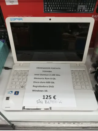 Ordenador portátil Toshiba en color blanco. - Procesador Intel Oentiun 2.100 Ghz. - Memoria RAM de 8 Gb. - Disco duro de 600 Gb. - Regrabadora DVD. - Sistema operativo Windows 10. - Precio: 125 € (SIN BATERÍA).