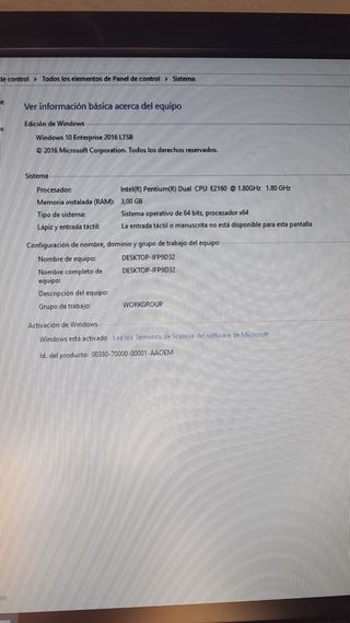 📦 PC de Escritorio – Windows 10 Enterprise – 930 GB Disco Duro 💻 Características Procesador: Intel Pentium G3260 @ 3.30GHz (2 núcleos) Memoria RAM: 4 GB Disco duro: 930 GB (más de 900 GB libres) Sistema operativo: Windows 10 Enterprise 2016 LTSB, activado Tipo de sistema: 64 bits ⚙️ Estado del equipo: Funcionando correctamente Ideal para tareas de oficina, navegación por internet, estudios o uso básico Todos los controladores instalados y sin errores de hardware 🔌 Incluye: CPU (torre) Windows 10 instalado y activado Puertos USB, red, audio, video, etc. 💬 Precio negociable. Se puede probar sin compromiso. Entrega en Mano o envio