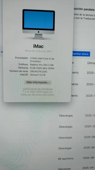 Impresionante iMac Retina 4K de 21.5 pulgadas del año 2017, con un disco duro SSD para un rendimiento ágil. - Procesador: 3 GHz Intel Core i5 de 4 núcleos. - Gráficos: Radeon Pro 555 de 2 GB. - Memoria RAM: 8 GB DDR4 a 2400 MHz. - Sistema Operativo: macOS Ventura 13.7.8. - Número de serie: C02VK1FKJ1G5.