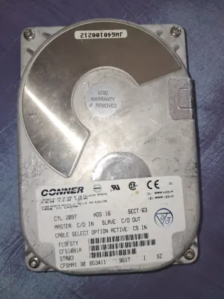 Disco duro interno de la marca Conner. - Modelo: CFS1081A - Capacidad: 1.08 GB - Interfaz: IDE - Cilindros: 2097 - Cabezales: 16 - Sectores: 63 - Fabricado en China