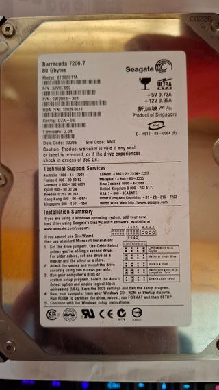 Disco duro interno Seagate Barracuda 7200.7 de 80 GB. - Modelo: ST380011A - Capacidad: 80 Gbytes - Configuración: DZA-08 - Firmware: 3.04 - Producto de Singapur El Seagate Barracuda 7200.7 ST380011A es un disco duro interno de 3.5 pulgadas con una capacidad de 80 GB. Al igual que otros modelos de su época (mediados de los 2000), utiliza la interfaz IDE (Ultra ATA/100) Características Técnicas Capacidad: 80 GB. Velocidad de rotación: 7200 RPM. Interfaz: IDE / PATA (Ultra ATA/100). Memoria Caché (Buffer): 2 MB. Tiempo de búsqueda promedio: Entre 8.5 ms y 9.5 ms. Tasa de transferencia (Sostenida): Hasta 58 MB/s. Factor de forma: 3.5