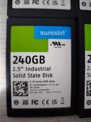 PRECIO OBVIAMENTE INDIVIDUAL Discos duros Sata 2,5” 240GB Industrial Disco fabricado para trabajar, aguantar muchas horas y cargas de trabajo. No me interesan ofertas absurdas. No me interesan cambios. Precio no negociable. Todos han sido probados y testeados con cristal disk, todos tienen 0 horas de uso por lo que están a estrenar. Podéis buscar el precio individual (Superan los 200€) Swissbit AG SFSA240GQ1AA4TO-C-HC-216-STD 2.5'' SSD Interfaz SATA III Capacidad 240 GB Velocidad de lectura (max.) 355 MB/s Velocidad de escritura (max.) 615 MB/s TBW (max.) 596 TB MTBF 2 000 000 horas Best-in-Class Performance and Endurance with dur