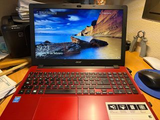 Portátil Acer Aspire E5 en color rojo. - Pantalla de 15.6 pulgadas. - Procesador Intel Core i5 - Disco duro SSD de 256 gb - 4 gb de RAM - Windows 10 - Teclado numérico integrado. - Webcam HD - Cargador incluido El disco duro que traía el ordenador de fábrica era un HDD que se sustituyó por un disco SSD que son de una tecnología más rápida, lo que hace que el ordenador vaya mucho más ligero y encienda más rápido. El ordenador funciona sin ningún problema y se encuentra en buen estado, con algunos arañazos y señales de uso (ver fotos), teniendo un rendimiento muy bueno pese a los años, gracias al cambio de disco duro