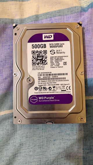 Disco duro interno de 500GB de capacidad. Modelo WD Purple. - Capacidad: 500GB - Interfaz: SATA - Caché: 64MB - Diseñado para vigilancia 24x7 - Fabricado en Tailandia