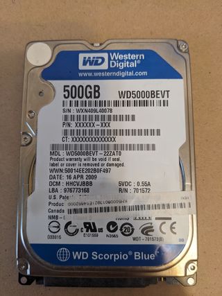 Disco duro WD 500 GB modelo WD5000BEVT S/N:WXN409L40078 MDL: WD5000BEVT-22ZAT0 Se vende exclusivamente para recuperación de datos. NO se vende para uso normal.