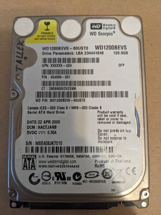 Disco duro WD 120 GB P/N: 454999-001 S/N: WXE408JK7010 Se vende exclusivamente para recuperación de datos. NO se vende para uso normal.