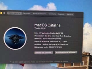 Impresionante iMac de 27 pulgadas de finales de 2013, perfecto para profesionales y creativos. Este equipo ofrece un rendimiento potente y una gran capacidad de almacenamiento. - Procesador: Intel Core i7 de 3,5 GHz con 4 núcleos. - Memoria RAM: 32 GB DDR3 a 1600 MHz. - Almacenamiento: Disco de arranque Macintosh HD - Datos (1 TB SSD). - Gráficos: NVIDIA GeForce GTX 775M con 2 GB de VRAM. - Sistema Operativo: macOS Catalina 10.15.7. No incluye ni mouse ni teclado