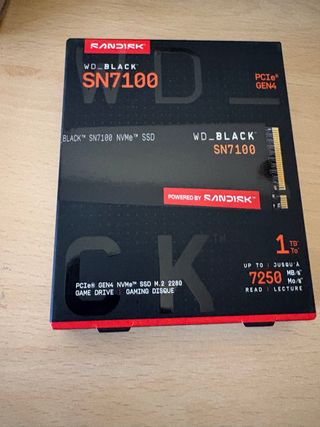 Disco de estado sólido WD_BLACK SN7100 de 1TB. - Interfaz PCIe Gen4 NVMe M.2 2280. - Velocidad de lectura de hasta 7250 MB/s. - Diseñado para gaming y uso intensivo. Nuevo, caja sin abrir.