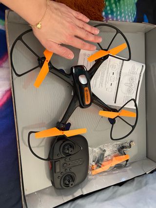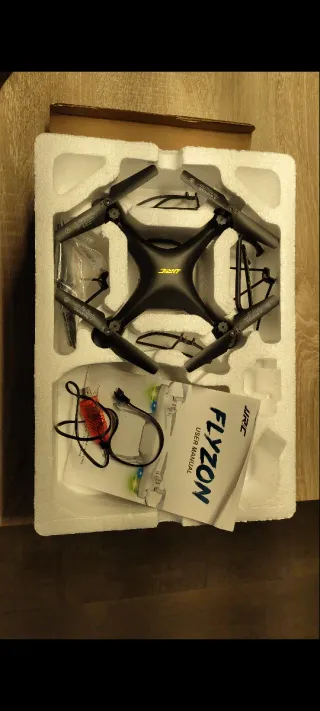 Dron teledirigido JRC Flyzon en color negro con detalles amarillos. Nunca se ha usado ✔️ Contenido en caja: -Respectivo mando a distancia -Manual de instrucciones -Carjador del dron (USB) -Patas (soporte de debajo) del dron -Aspas, las que se veen y de repuesto -Tornillos necesarios PRECIO NEGOCIABLE