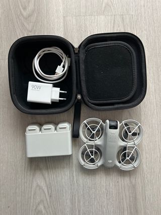 Dron DJI Neo en color gris y blanco, con accesorios. - 3 baterias - Cargador de 90W - Cable de carga - Soporte para baterías