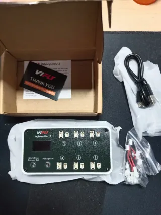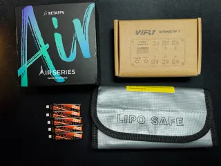 Se vende dron Betafpv Air65 con cargador VIFLY Whoopstor 3 y baterías. - Dron Betafpv Air65 - Cargador VIFLY Whoopstor 3 en blanco - 5 baterías Betafpv Lava de 260mAh. Incluyo una bolsa de transporte de Lipos. El dron está sin estrenar, ni siquiera lo he conectado al pc aún. El cargador y las baterías solo se han usado una vez, para ponerlas en modo storage. Se vende por no usar. Portes a cargo del comprador.