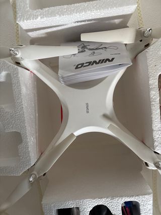 Dron Ninco en color blanco, listo para volar. - Incluye hélices de repuesto. - Mando a distancia. - Batería. - Cargador.