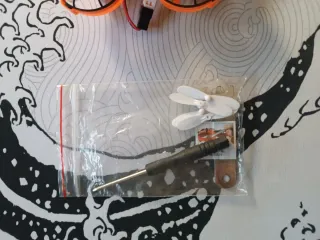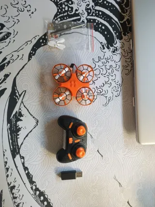 Mini dron portátil con control remoto y accesorios. - Incluye hélices de repuesto. - Herramienta para el montaje. - Cable de carga USB. - Control remoto con joysticks naranjas. -Cargador