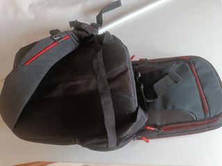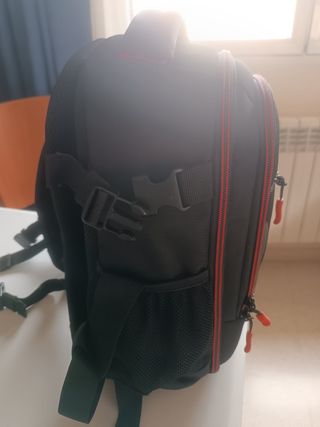 Mochila para cámara réflex, nunca usada. Diseño moderno en negro con detalles en rojo. - Compartimentos acolchados para proteger el equipo. - Correas ajustables para mayor comodidad. - Cremalleras robustas.